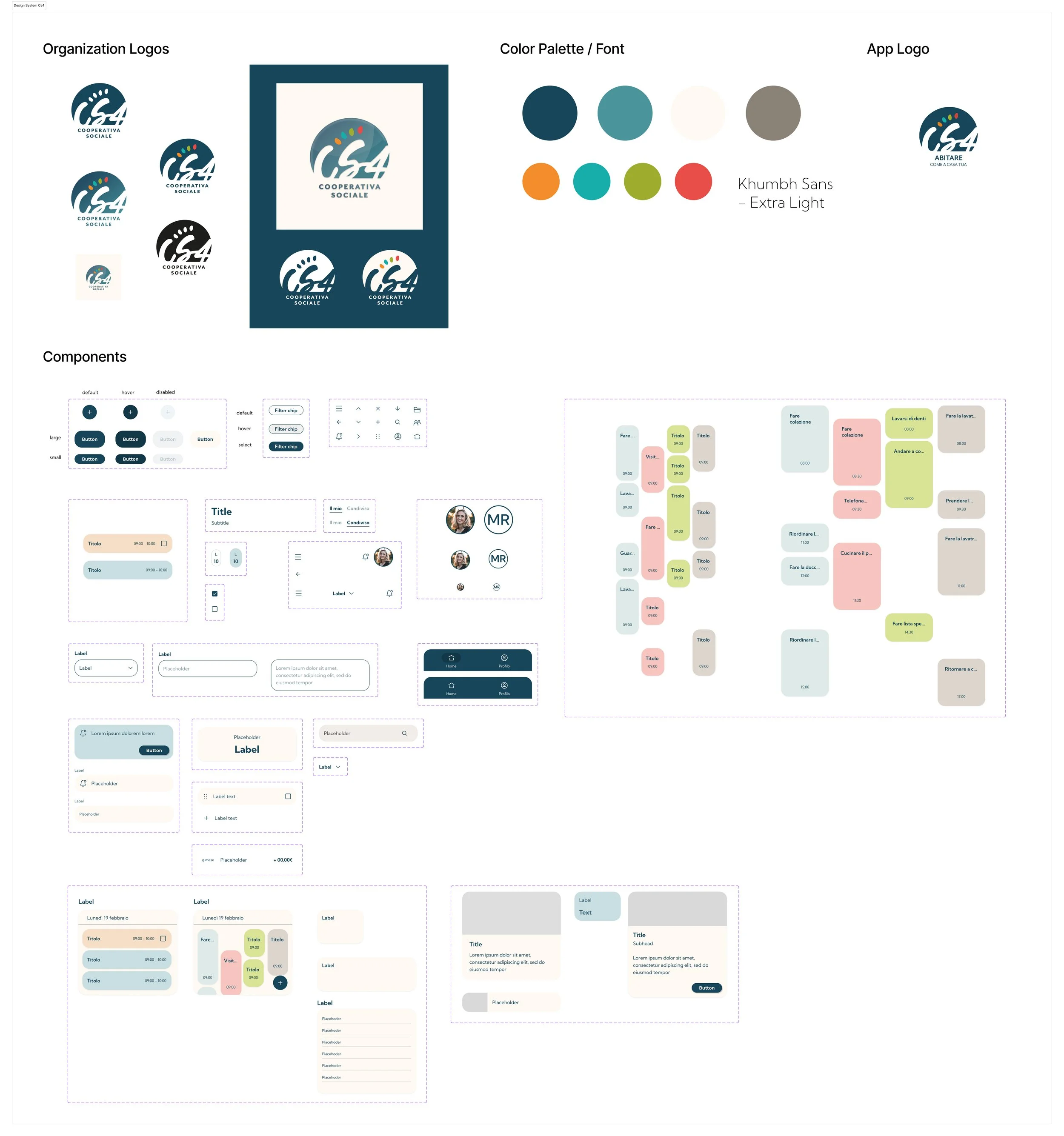 A comprehensive report was delivered to the client at the end of the week, including a starting point for the Design System and the app components. The colors were chosen starting from the official logo of the social cooperative.